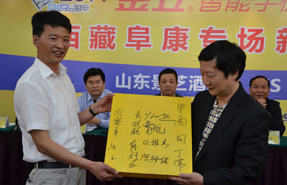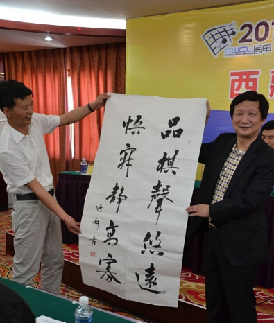 發(fā)布會(huì)最后曹大元九段代表兩隊(duì)棋手像王斌贈(zèng)送國(guó)手簽名的棋盤,王斌則用三幅字回贈(zèng)兩隊(duì)。