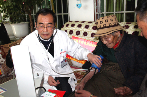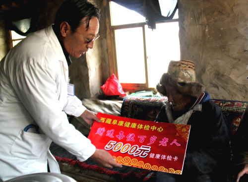 西藏高寒缺氧,自然環(huán)境惡劣,60多年前,這里的人均壽命才35.5歲。然而60多年后,2012年拉薩市所有七縣一區(qū)百歲老人就有16位,這些走過兩個世紀的百歲老人,見證了西藏翻天覆地的滄桑巨變,他們是全社會的寶貴財富,更是西藏從貧窮走向繁榮富強的親歷者、見證者。在全國人民喜迎黨的十八大勝利召開之際,西藏阜康(國際)體檢中心與拉薩市民政局老齡辦組織發(fā)起了“關愛百歲老人行動”。我們歷時16天,里程2000多公里,尋訪了拉薩七縣一區(qū)十一位百歲老人,我們不僅為每位老人送上了精心準備的三千元現(xiàn)金、五千元健康體檢卡、一個便攜式氧氣瓶、一個便攜式血壓儀,還為他們送上了免費義診和相關藥品。王斌董事長參加了此項活動的啟動儀式,嘎布院長、張德才院長親自帶隊為每一位百歲老人做了常規(guī)的身體檢查,并送上了藥品和祝福。