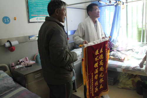 患者及家屬在出院當(dāng)天,對我院的骨科醫(yī)生獻上哈達,錦旗表達了感謝之情。