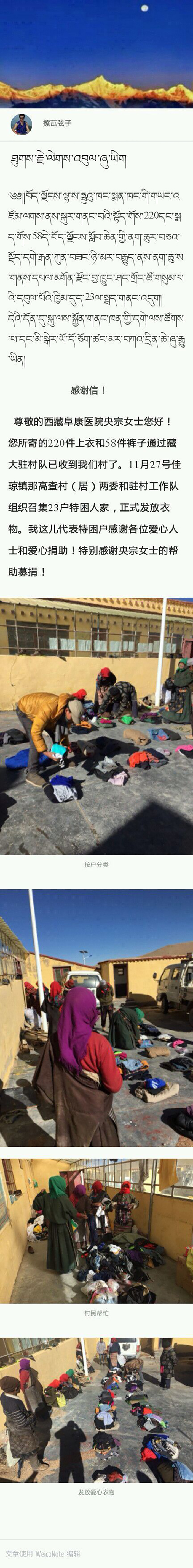 2016年11月27日,佳瓊鎮(zhèn)那高查村(居)兩委和駐村工作隊(duì)組織召集23戶特困人家,正式發(fā)放了由西藏阜康醫(yī)院物資庫(kù)央宗女士請(qǐng)?jiān)摯羼v村工作隊(duì)一位老師幫忙捎帶去的220件上衣、85件褲子。