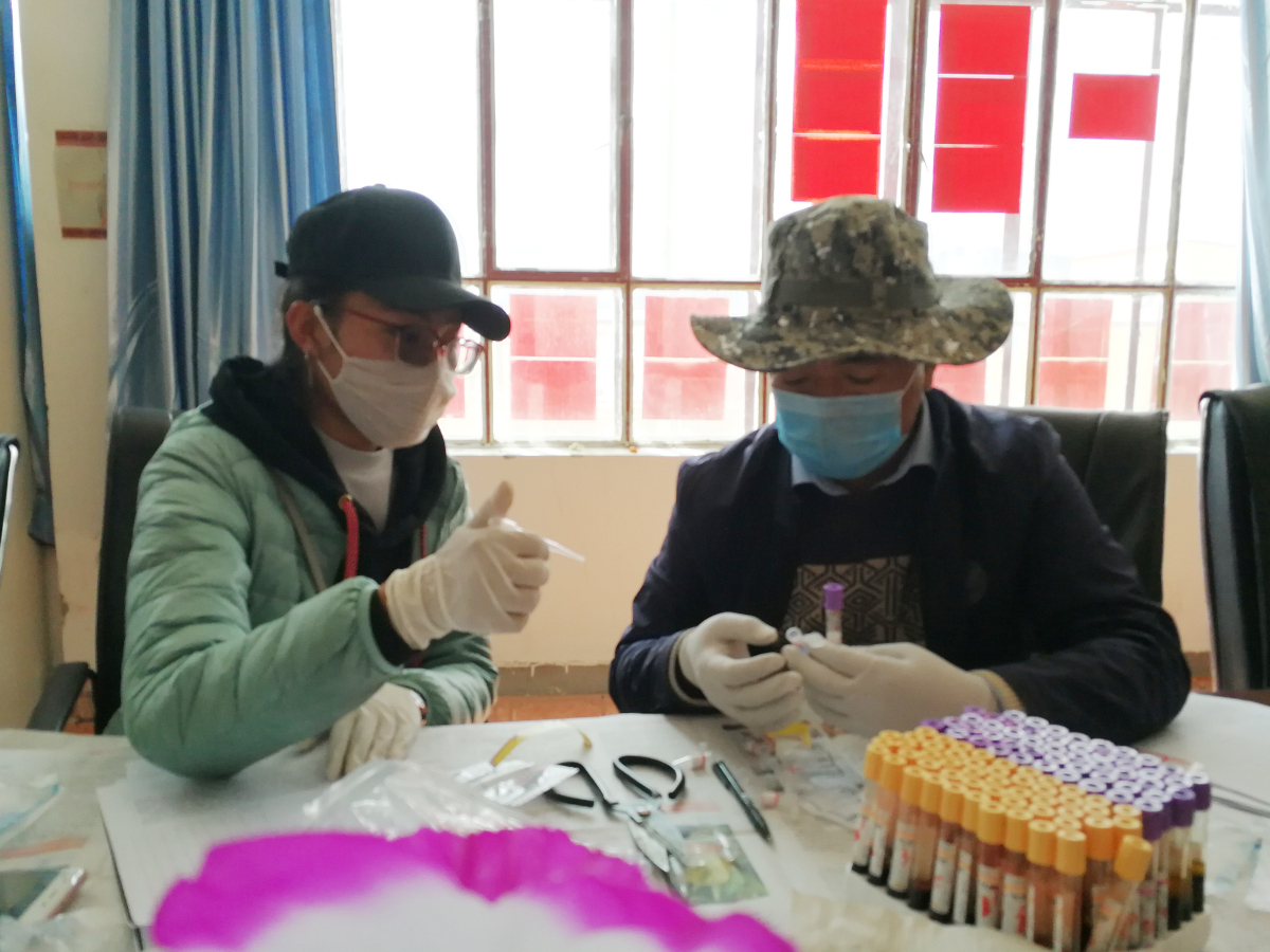 鐘義華、劉亞美、丁雪琴分到另一組,負責采血和血樣信息錄入工作。鐘義華是檢驗士也是隊長,更是我們醫(yī)療隊唯一的男孩子,重活、粗活全包,還要負責隊員的工作安排,以及與政府領導、工作人員的溝通協(xié)調,除此之外,他還要負責血樣采集、包蟲病防治的宣傳。