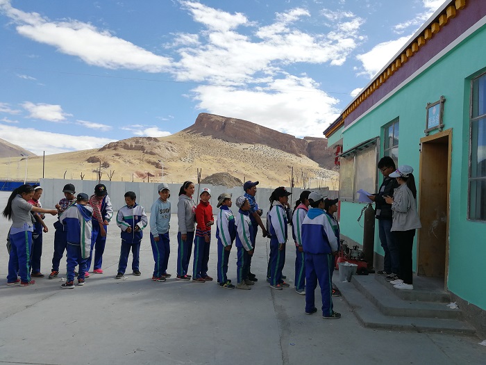 我跟隨劉冬梅醫(yī)生組前往革吉縣初級中學(xué)進(jìn)行篩查工作,學(xué)生們在班主任的帶領(lǐng)下,排著整齊的隊(duì)伍,填寫資料、做B超、抽血留樣,秩序井然。