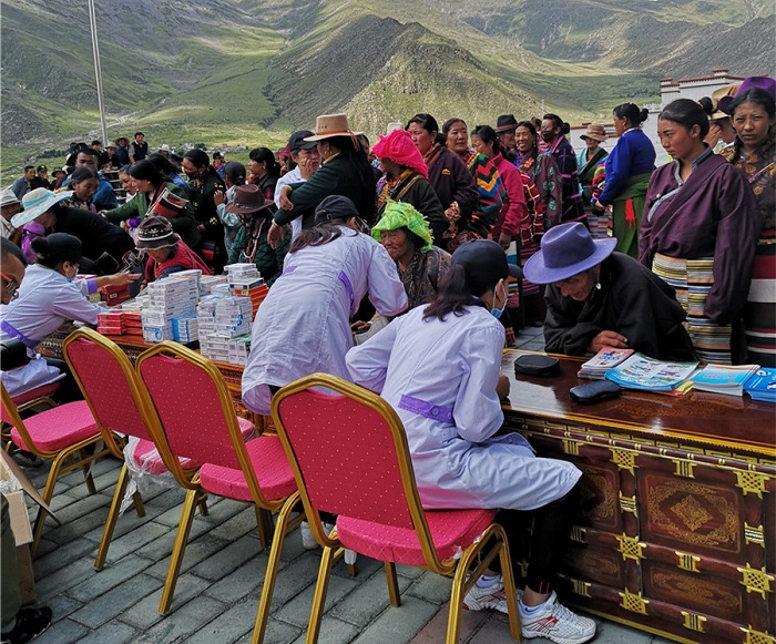 當(dāng)天上午,全國(guó)婦聯(lián)宣傳部、自治區(qū)婦聯(lián)、拉薩市婦聯(lián)、那曲市婦聯(lián)一行來到安置點(diǎn)為群眾贈(zèng)送了藏漢雙語(yǔ)書籍。阜康義診工作隊(duì)也來到現(xiàn)場(chǎng)為安置點(diǎn)居民量血壓、檢查病情并詢問身體情況,耐心細(xì)致地為群眾分析病情、講解日常衛(wèi)生保健、合理用藥等衛(wèi)生常識(shí),認(rèn)真解答關(guān)于常見病、多發(fā)病的預(yù)防診治及愈后注意事項(xiàng)。僅一個(gè)上午時(shí)間就為100余名安置點(diǎn)群眾開展了問診、聽診、答疑、測(cè)血壓和健康知識(shí)宣傳,免費(fèi)發(fā)放各類藥品價(jià)值4萬(wàn)余元 。