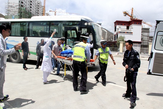 “我公司旅游車藏AL0887去機(jī)場途中,在柳梧村附近發(fā)生側(cè)翻,有乘客受傷,請求支援。”隨著模擬報警電話響起,此次應(yīng)急演練正式開始。旅游公司、110、120分別接到報警電話后,迅速趕往“事故現(xiàn)場”進(jìn)行救援,同時,西藏旅游汽車公司也立即啟動應(yīng)急預(yù)案。