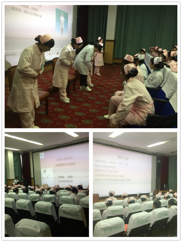 2018年4月9日下午7點(diǎn),西藏阜康醫(yī)院、西藏阜康醫(yī)院婦產(chǎn)兒童分院、西藏阜康醫(yī)院心腦血管分院三家醫(yī)院護(hù)理部組織開展了導(dǎo)醫(yī)服務(wù)禮儀培訓(xùn),培訓(xùn)內(nèi)容涵蓋了導(dǎo)醫(yī)的儀容儀表、站姿、坐姿、行姿、手勢引領(lǐng)病人、電話禮儀、文明用語等,參加培訓(xùn)的導(dǎo)醫(yī)人數(shù)為34人。