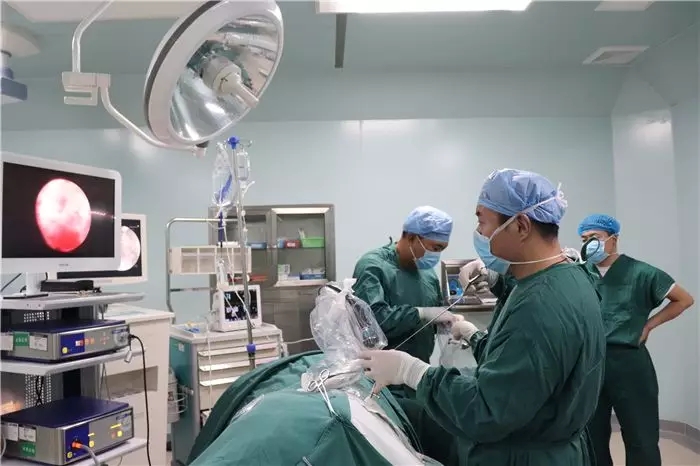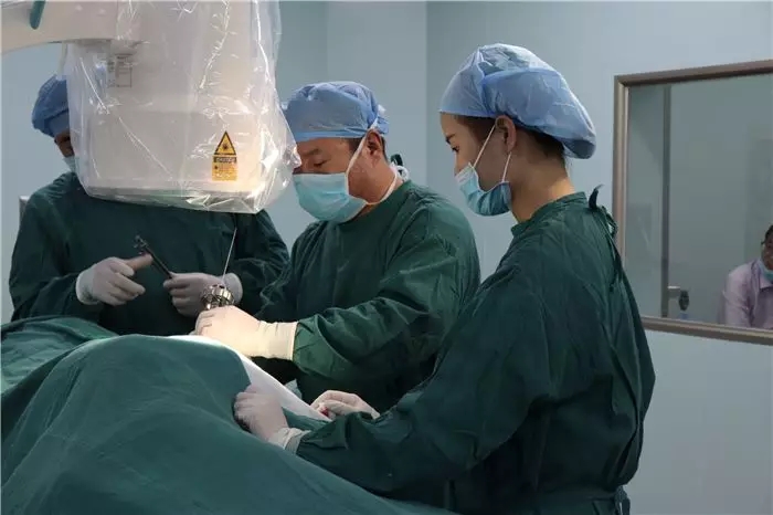 13:00時(shí),徐鑫一行來(lái)到病房,對(duì)即將接受手術(shù)的患者進(jìn)行術(shù)前評(píng)估,看過(guò)核磁共振和CT檢查資料,通過(guò)交流討論最終確定了手術(shù)方案。13:35分患者被推進(jìn)手術(shù)室,本次手術(shù)由徐鑫和阜康醫(yī)院骨科醫(yī)師李延軍共同完成。手術(shù)運(yùn)用BEIS技術(shù),在定位階段專家們多次透視確保儀器直達(dá)患處,以確保摘除髓核準(zhǔn)確無(wú)誤、減少患者創(chuàng)傷。髓核摘除后,患者疼痛麻木感隨即消失,手術(shù)圓滿成功,16:25分患者被推出手術(shù)室,專家嚴(yán)謹(jǐn)細(xì)致的作風(fēng)以及精湛的技術(shù)贏得醫(yī)務(wù)人員的掌聲。椎間孔鏡微創(chuàng)手術(shù)的重點(diǎn)在于透視定位,只有精準(zhǔn)定位才能保證準(zhǔn)確摘除髓核,減少患者疼痛與創(chuàng)傷。