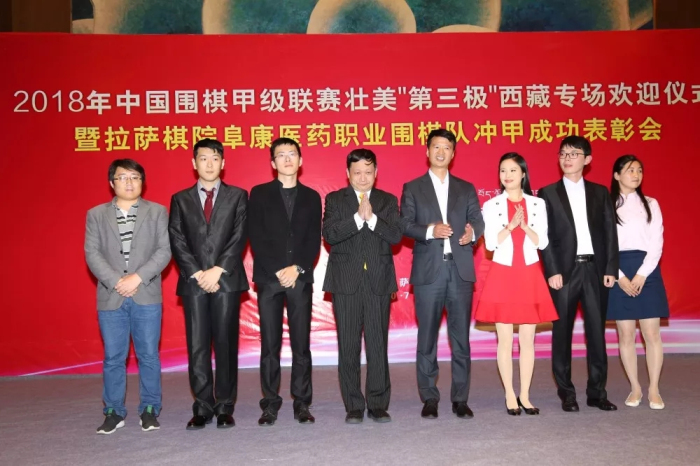 10月7日,2018年中國圍棋甲級(jí)聯(lián)賽壯美“第三極”西藏專場(chǎng)歡迎儀式暨拉薩棋院阜康醫(yī)藥職業(yè)圍棋隊(duì)沖甲成功表彰會(huì)在香格里拉大酒店隆重舉行。西藏自治區(qū)黨委副書記、政府主席齊扎拉,中國圍棋協(xié)會(huì)主席林建超,區(qū)政府副主席甲熱·洛桑旦增,國家體育總局棋牌運(yùn)動(dòng)管理中心黨委書記、主任、中國棋院院長(zhǎng)朱國平,中國棋院圍棋部部長(zhǎng)王誼,西藏自治區(qū)體育局黨組書記劉伯清、局長(zhǎng)尼瑪次仁,拉薩市委常委、常務(wù)副市長(zhǎng)占堆,自治區(qū)高級(jí)人民法院副院長(zhǎng)佘克冰,人民日?qǐng)?bào)西藏分社社長(zhǎng)鄧建勝,山東圍棋隊(duì)主教練、拉薩棋院名譽(yù)院長(zhǎng)、名譽(yù)總教練曹大元,世界冠軍羅洗河,山東景芝酒業(yè)隊(duì)領(lǐng)隊(duì)、齊魯晚報(bào)棋院院長(zhǎng)劉瑋,衢州巴格斯隊(duì)領(lǐng)隊(duì)薛廣靈,新華網(wǎng)西藏分公司常務(wù)副總編輯劉子明,拉薩棋院院長(zhǎng)、拉薩棋院阜康醫(yī)藥職業(yè)圍棋隊(duì)領(lǐng)隊(duì)王斌,中央電視臺(tái)圍棋欄目主持人、拉薩棋院常務(wù)副院長(zhǎng)陳盈以及山東隊(duì)、衢州隊(duì)的隊(duì)員們出席了本次活動(dòng)。