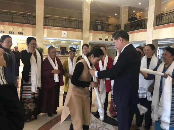 西藏自治區(qū)黨委常委、組織部部長曾萬明為西藏阜康醫(yī)藥發(fā)展有限公司總經(jīng)理劉瀟瀟女士獻(xiàn)上潔白的哈達(dá)