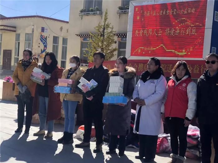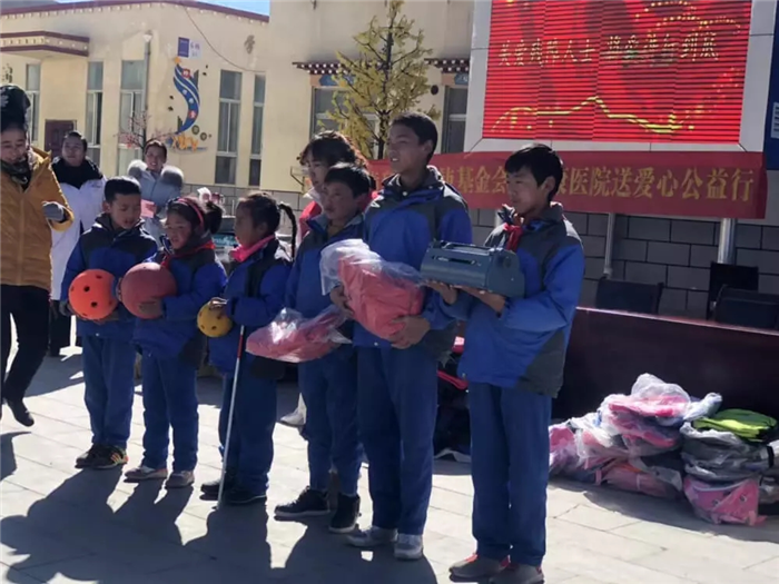 11月1日上午,西藏阜康天使基金會吉拉女士受西藏阜康醫(yī)療股份有限公司黨委書記、阜康天使基金會會長王斌先生,西藏阜康醫(yī)療股份有限公司總經(jīng)理、阜康天使基金會秘書長劉瀟瀟女士委托與西藏阜康醫(yī)院義診隊一起,攜價值一萬五千元的藥品和兩萬元的物資來到那曲市特殊教育學(xué)校,為這里的孩子們帶來了文化體育學(xué)習(xí)用品及藥品等物資。在特校校長次仁拉姆的組織下,特校師生列隊歡迎我們的到來,還精心準(zhǔn)備了錦旗和潔白的哈達(dá)。