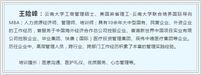 王險峰以“為什么來培訓(xùn)”開題,對本次培訓(xùn)的目的與意義進(jìn)行了說明,調(diào)動了在場員工學(xué)習(xí)積極性。接下來他對“規(guī)范醫(yī)療”、“安全醫(yī)療”、“效率醫(yī)療”、“溫度醫(yī)療”四種醫(yī)療模式進(jìn)行區(qū)別解讀,以加深員工對“優(yōu)質(zhì)醫(yī)療服務(wù)”的理解。王險峰介紹,北京市朝陽區(qū)桓心腫瘤醫(yī)院院長丁劍曾說“無溫度,不醫(yī)療。溫度醫(yī)療是整個非公醫(yī)療行業(yè)的出路”,阜康作為民營醫(yī)療機(jī)構(gòu),開展“溫度醫(yī)療”,提供“優(yōu)質(zhì)服務(wù)”是發(fā)展壯大的重要途徑。接下來他就如何營造“溫度醫(yī)療”進(jìn)行展開論述,分別從“什么是服務(wù)和優(yōu)質(zhì)服務(wù)”、“職業(yè)化態(tài)度與服務(wù)能力”、“與患者家屬建立良好關(guān)系”、“語言和非語言能力及傾聽能力”、“談判技巧與化解沖突能力”、“禮儀行為規(guī)范”六個方面進(jìn)行闡釋。