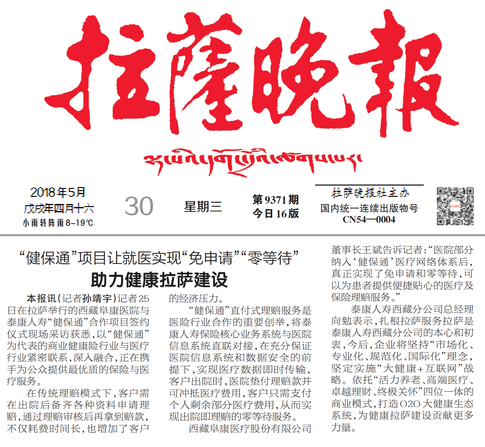 西藏阜康醫(yī)療股份有限公司董事長王斌告訴記者:“醫(yī)院部分納入‘健保通’醫(yī)療網(wǎng)絡體系后,真正實現(xiàn)了免申請和零等待,可以為患者提供便捷貼心的醫(yī)療及保險理賠服務。”