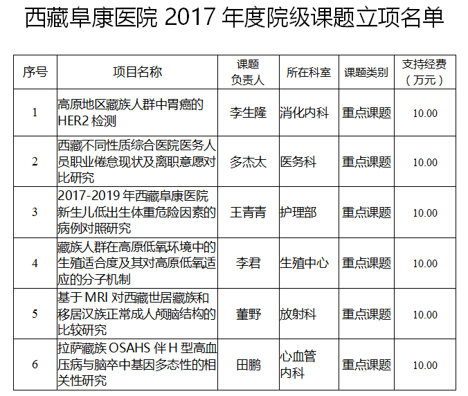 這是我院首次組織申報(bào)并批準(zhǔn)立項(xiàng)的院級課題。課題主持人均為我院醫(yī)務(wù)人員。本年度立項(xiàng)資助的6個(gè)課題均為院級重點(diǎn)課題,每項(xiàng)課題將提供10萬元的研究經(jīng)費(fèi)。課題自2017年10月1日正式實(shí)施,期限為兩年。