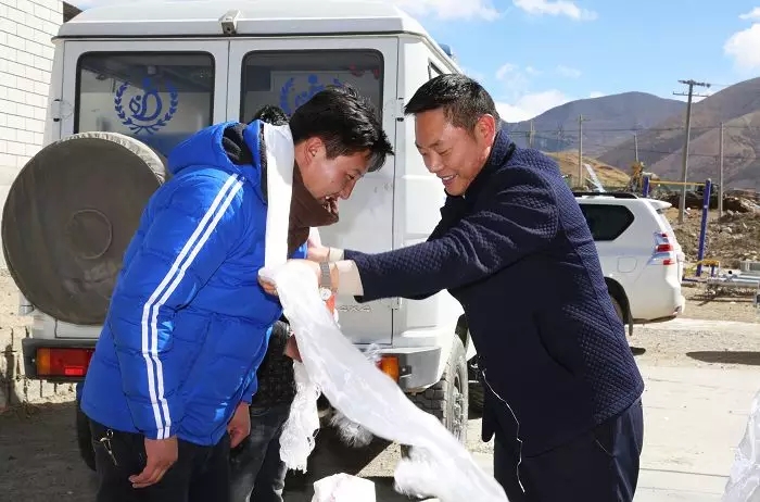 ●公司黨委副書記、副總經(jīng)理陳彬?yàn)榧卫杩h夏瑪鄉(xiāng)一村村民獻(xiàn)上哈達(dá)