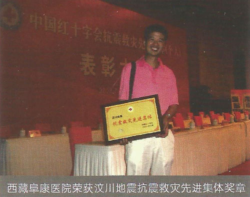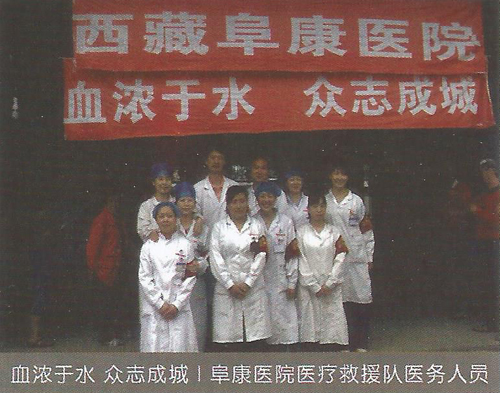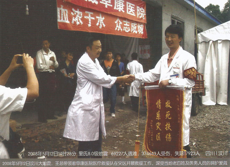 2008年5月12日14時(shí)28分,在得知發(fā)生在四川汶川8級(jí)的強(qiáng)烈地震后,王斌被深深的震撼了,5月13日第一時(shí)間帶頭捐款并號(hào)召全公司347名員工為災(zāi)區(qū)人民獻(xiàn)愛心,在王斌的帶領(lǐng)下短短的一上午公司即向西藏紅十字會(huì)捐款10062萬元(其中王斌個(gè)人捐款5062萬元)。13日下午,王斌隨即召開阜康醫(yī)院醫(yī)務(wù)人員趕赴災(zāi)區(qū)醫(yī)療救援動(dòng)員大會(huì),并迅速組建了一支由他本人作為領(lǐng)隊(duì)的26人醫(yī)療救援隊(duì)。同時(shí)他還帶領(lǐng)醫(yī)療隊(duì)為盡快抵達(dá)地震災(zāi)區(qū)并第一時(shí)間參與醫(yī)療救援,而且決定在成都臨時(shí)購買一輛配備完善的救護(hù)車,還包括大量藥品、生活物品、以及部分醫(yī)療設(shè)備,此次救災(zāi)共投入130余萬元。