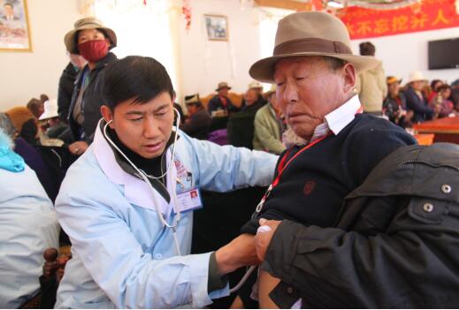 離義診時(shí)間還有二十多分鐘,現(xiàn)場(chǎng)就聚集了像洛桑一樣的20多位老人,他們井然有序的排隊(duì)等著念到自己的名字,醫(yī)生開始為老人們測(cè)血壓、問病情、開處方、發(fā)藥品。大家忙的不亦樂乎。