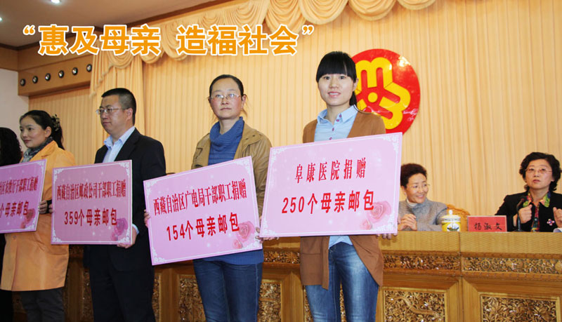 2013年5月1日上年十點(diǎn),西藏自治區(qū)“母親郵包”公益活動(dòng)暨捐贈(zèng)儀式在自治區(qū)常委會(huì)議室內(nèi)正式啟動(dòng)。西藏阜康集團(tuán)懷著高度的社會(huì)責(zé)任感心系天下母親,當(dāng)天共捐贈(zèng)總價(jià)值五萬元的郵包250個(gè),并呼吁全體阜康人為天下母親捐贈(zèng)郵包,奉獻(xiàn)自己的愛心。