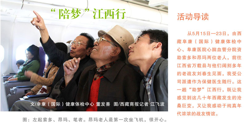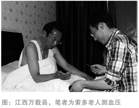 我們5月15日從拉薩出發(fā),一路向東,到成都轉(zhuǎn)機(jī),兩天的時(shí)間,已經(jīng)跨越了2400多公里。16日,載著夢(mèng)想的飛機(jī)抵達(dá)了江西南昌機(jī)場(chǎng),劉春生老人的大兒子在機(jī)場(chǎng)熱情地迎接我們,將我們接到老人的故鄉(xiāng)萬(wàn)載縣。我們決定在縣城賓館休息一天后再啟程前往劉春生老人的家,于是我為同行的兩位老人做了全面的檢查,索多老人的血糖在7.0mmol/L左右,令我擔(dān)心的是昂瑪老人血壓本來(lái)就偏高而且又是第一次去內(nèi)地,他的血壓波動(dòng)在140-150/90-100mmHg,比較平穩(wěn),我叮囑老人見(jiàn)面時(shí)注意控制情緒,不要過(guò)于激動(dòng)。