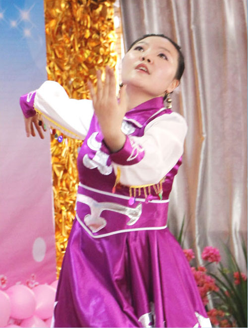 丹丹告訴筆者,之所以會選擇“鴻雁”這支舞蹈,是因為喜歡上了“鴻雁”那首歌,歌聲悠揚婉轉(zhuǎn),仿佛把她帶到了大草原,看到了美麗的牧羊姑娘,看到了悠閑的馬兒,看到了像白蓮花般盛開的氈包……因為找不到合適的舞伴,丹丹只好把這支集體舞改成了獨舞,練習(xí)中她不是純粹的模仿,也會適當(dāng)?shù)馗木?。練?xí)鴻雁時自己傷佛也變成了一只北歸的大雁,那是一種很奇妙的感覺。能夠在此次演出中獲得大家的認(rèn)可更是堅定了她練習(xí)舞蹈的決心,丹丹表示會繼續(xù)練習(xí)舞蹈,爭取在下一次的演出中帶給大家更美的視覺盛宴。