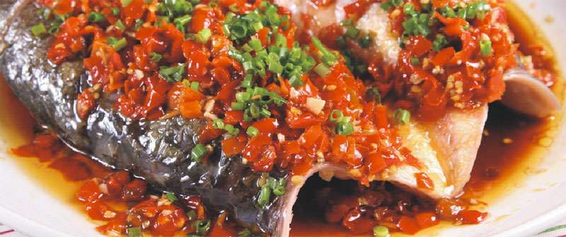 剁椒魚頭屬湘菜系,是湘潭的一道名菜。據(jù)說可以追溯到雍正年間,當(dāng)時正大興文字獄,著名的反清文人黃宗憲,在出逃的路上,途經(jīng)湖南的一個小鄉(xiāng)村,借住在一個貧苦的農(nóng)戶家。怡好農(nóng)戶的兒子從田間池塘中捕回一條河魚,解了女主人的巧婦之愁,于是就用河魚做菜。魚洗凈后,魚肉放鹽煮湯,再用自家產(chǎn)的辣椒剁碎后與魚頭同蒸,不想黃宗憲吃了覺得非常鮮美?;丶液螅尲依锏膹N師將這道菜加以改良,于是便有了今天的“剁椒魚頭”。