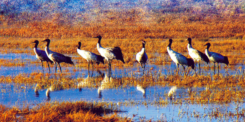 好不容易見到三只,小彭一邊扭著身子一邊低聲自語:“黑頸鶴呀黑頸鶴,你轉(zhuǎn)過身子抬起頭來看看我。又不是孔雀,干嗎總把屁屁朝這邊。”黑頸鶴不懂人語,也懶得猜人的心思。有一點(diǎn)可以保證,這里雖然車來人往,卻是安全的。